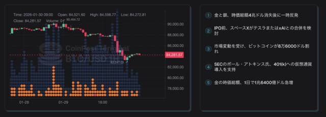 加えて、株式市場の上昇と歩調を合わせ史上最高値圏で推移していたゴールドおよびシルバーが瞬間的に急落したことも、市場全体を冷やす要因となった。