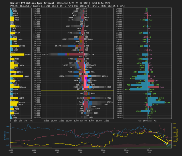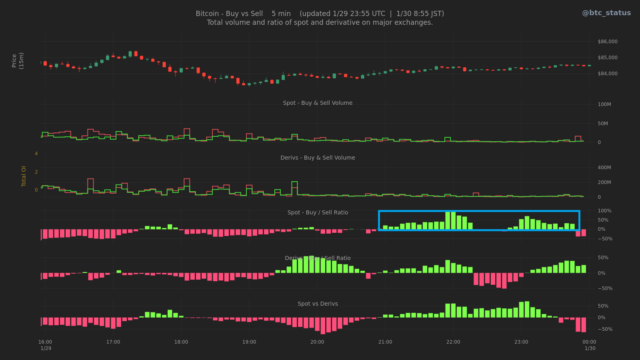 成行注文の動向を見ると、現物市場では断続的な売りが観測されたものの、8万4千ドル近辺では押し目買いが入り、一定の下値支持が確認された。