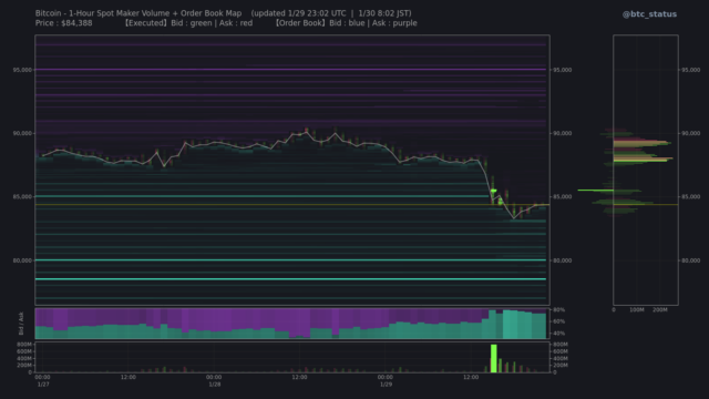 オーダーブックを確認すると、9万5千ドルから8万ドルにかけて流動性が薄い状態にあり、価格が急変動しやすい市場構造となっており、ボラティリティが増幅されやすい局面といえる。