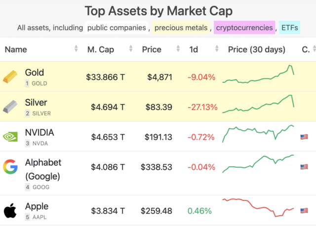 対照的に、金は記録的な上昇を経て時価総額で首位の座を大きく引き離して確固たるものにし、ビットコイン時価総額の20倍となっている。世界最大の資産としての地位を固めている。