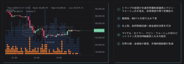 ビットコイン(BTC)は31日、トランプ米大統領による連邦準備制度理事会(FRB)次期議長の指名を受け、金融市場全体が動揺したことから一時急落した。その後は買い戻しが優勢となり反転し、24時間比で一時約50万円幅の上昇を記録した。