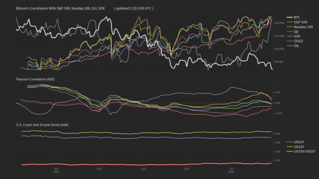 また、ビットコインと主要アセットクラスとの相関(観測期間2か月)を見ると、ゴールドとは-0.27と弱い逆相関を示している。さらに、S&P 500(-0.03)、原油(+0.10)などとも有意な相関性は確認されず、足元では独立した値動きが続いている。