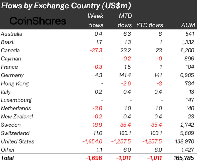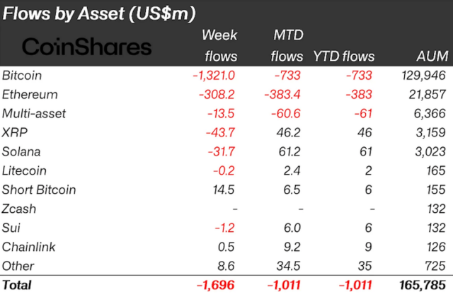 暗号資産(仮想通貨)投資企業CoinShares(コインシェアーズ)でリサーチ部門のトップを務めるジェームズ・バターフィル氏は2日、ETFなどのデジタル資産投資商品全体の先週における資金フローは、約17億ドル(約2,646億円)の純流出だったと報告した。