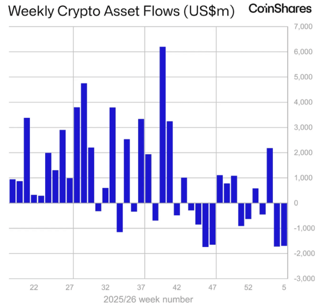 流出の要因についてコインシェアーズは、金融引き締めに前向きな「タカ派」とされるケビン・ウォーシュ氏が米連邦準備理事会(FRB)の次期議長に指名されたこと、ビットコイン(BTC)の4年サイクルに関連した大口投資家(クジラ)の売却の継続、地政学リスクの高まりなどが背景にあると考えているとバターフィル氏は説明した。