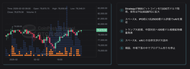 下落要因となっていた貴金属市場におけるパニック的な売りがひとまず一服したことに加え、一時的に含み損となっていたビットコイントレジャリー企業であるストラテジー社が、ビットコインの追加購入を発表したことなどが相場の支援材料となった。