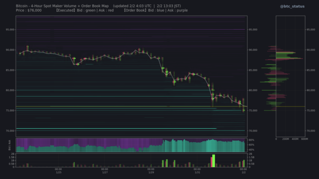 また、オーダーブックの状況を確認すると、全体的に板が薄くなっており、ボラティリティが高まりやすい環境にある。