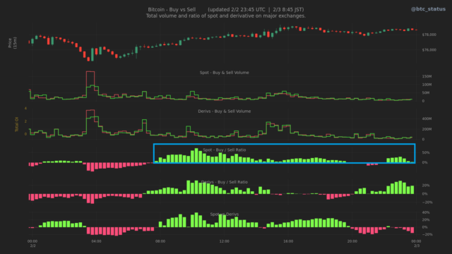 成行注文の動向をみると、現物市場を中心に買いが入っている(下画像青枠)。年初来最安値を更新した後のビットコイン価格の回復は、デリバティブ主導ではなく現物需要によるものであることが確認できる。