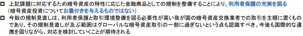 なお、WG報告では今回の規制見直しが暗号資産投資へのお墨付きを与えるものではないことが明記された。その上で、「規制が及ぶ範囲は国内交換業者での取引が中心であり、グローバルな暗号資産取引の一部に過ぎないことを認識すべき」としている。