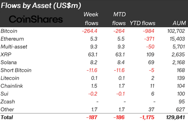 今回バターフィル氏は、デジタル資産投資を原資産ごとや国別に見ると、資金の分散が明確になっていると指摘。以下の表の通り、主にビットコインの投資商品から資金が純流出する一方で、XRPが年初来の資金流入額で最も成功している資産の地位を維持し、イーサリアム(ETH)とソラナ(SOL)とともに純流入を主導したと述べている。