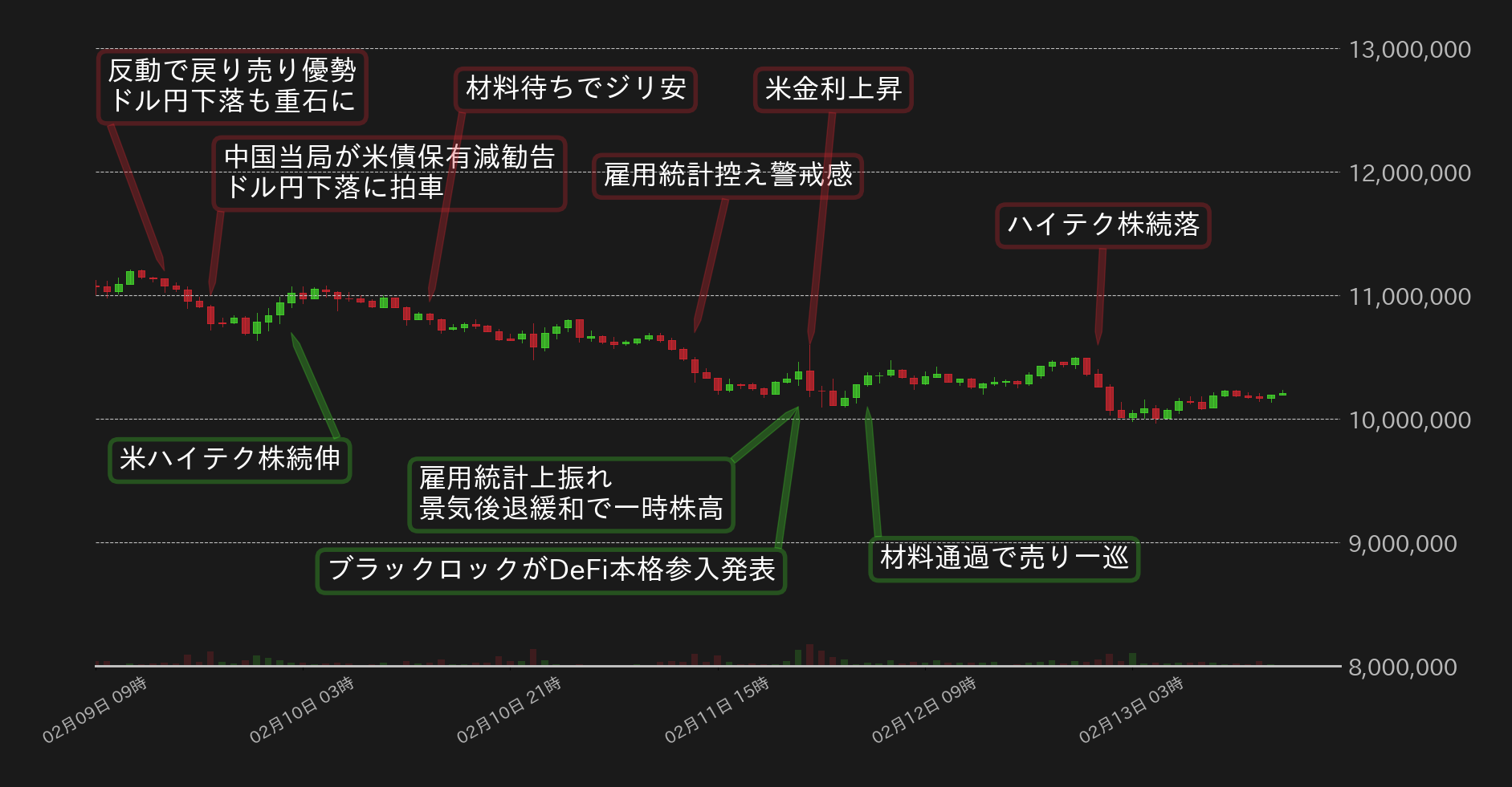 雇用統計前に売りがある程度出尽くしていたことから、材料消化後のBTCは底堅く推移し、12日の欧州勢参入後には1050万円まで回復するも、AI普及によるテクノロジーセクターの競争激化を嫌気したハイテク株の売りが波及し、米国時間には1000万円周辺まで下落。