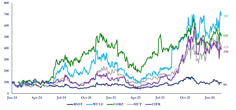 スターボード・バリューは、ライオットの株価パフォーマンスを、テラウルフ、コアサイエンティフィック、ハット8、サイファーマイニングなどの好調な競合他社と比較するチャートを示した。なお、これらの企業の選択は恣意的であるとも注意点を添えている。