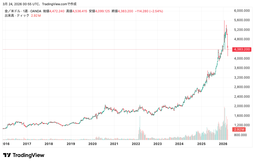 こうした中、金(ゴールド)価格も高騰。ドル建て価格はトロイオンスあたり一時5,000ドルを超え歴史的高値を更新した後、直近は4,383ドル前後まで調整。それでも直近1年間の上昇率は約44%に達している。