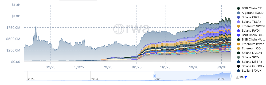 トークン化株式の時価総額は一時急騰後に低迷した時期を経て、2025年9月以降に再び急拡大。取り扱い銘柄・チェーンの多様化とともに成長が加速し、2026年3月時点では約9億850万ドルへ。