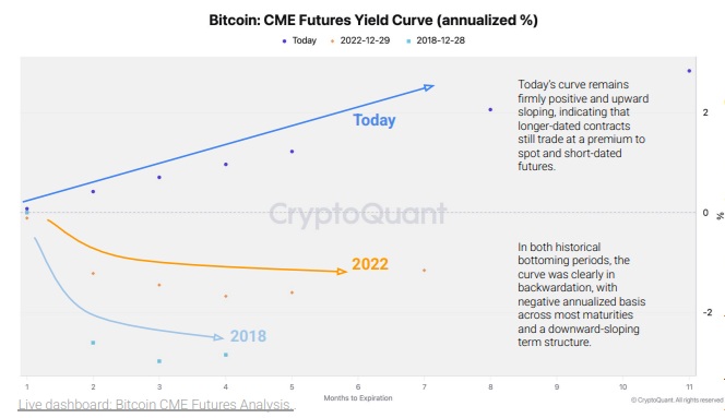 CMEで取引されているビットコイン先物について、満期(期限)の違いごとに算出した年率ベースの利回り(=ベーシス)を並べた曲線のこと。横軸は先物の満期の長さ、縦軸はスポット価格に対する先物価格の差を年率換算したものである。