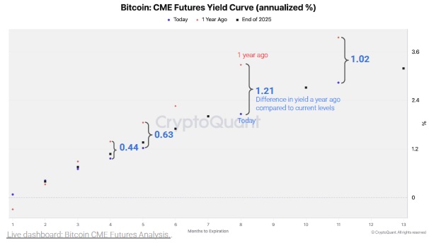 まず、CME(シカゴマーカンタイル取引所)のビットコイン先物のイールドカーブ(利回り曲線)は、1年前や2025年後半と比べて全体的に低下している。特に、レバレッジをかけたロングに対する需要の弱まりを示しているところだ。