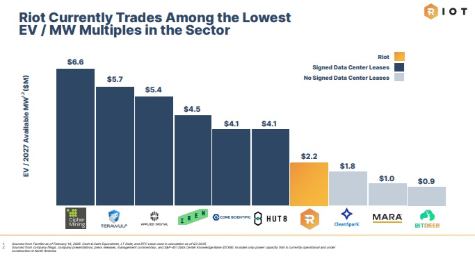 ライオットは今回、これに応答する形でグラフを提示。同業他社と比較して電力容量(1メガワット)あたりの企業価値(EV)という観点で、低い水準にあると指摘した。