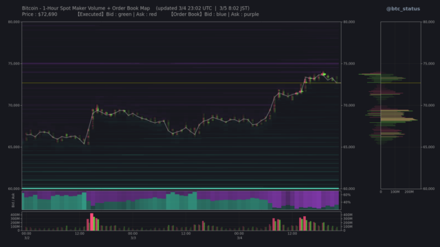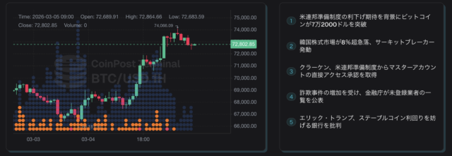 ビットコイン(BTC)は、3月4日から5日にかけて急騰し、上昇幅は一時100万円を超えた。