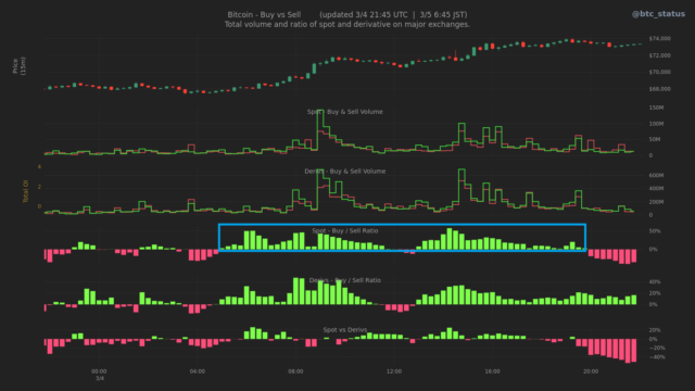 成行注文の状況では現物市場を中心に買い注文が多く入っており、実需を伴った上昇であることが確認できる(下画像青枠)。