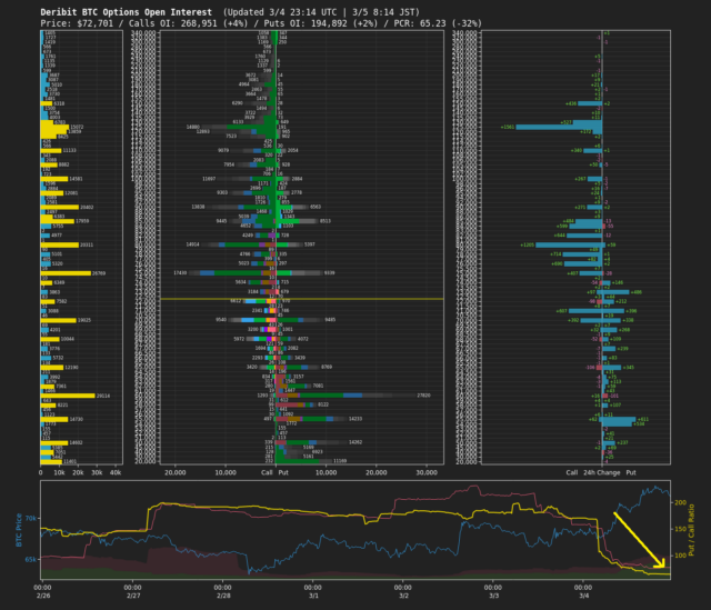 加えて、オプション市場ではPCR(プット・コール・レシオ)が大きく低下しており(下画像黄矢印)、投資家のセンチメントが強気方向へ転じていることが読み取れる。