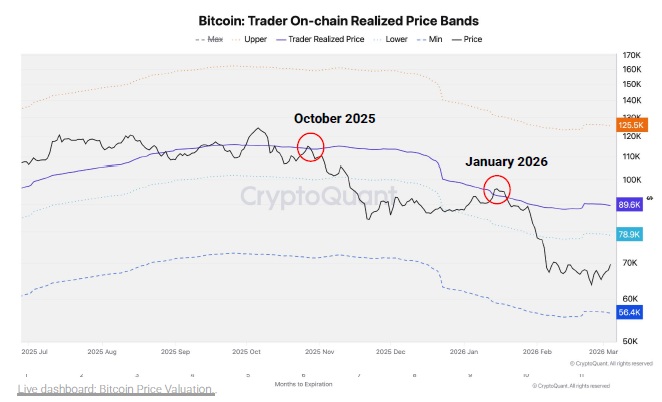 この水準は、市場参加者の平均BTC取得価格であるオンチェーン実現価格(青い点線)ゾーンの下の端を表しており、歴史的に弱気相場では抵抗線として機能してきた。