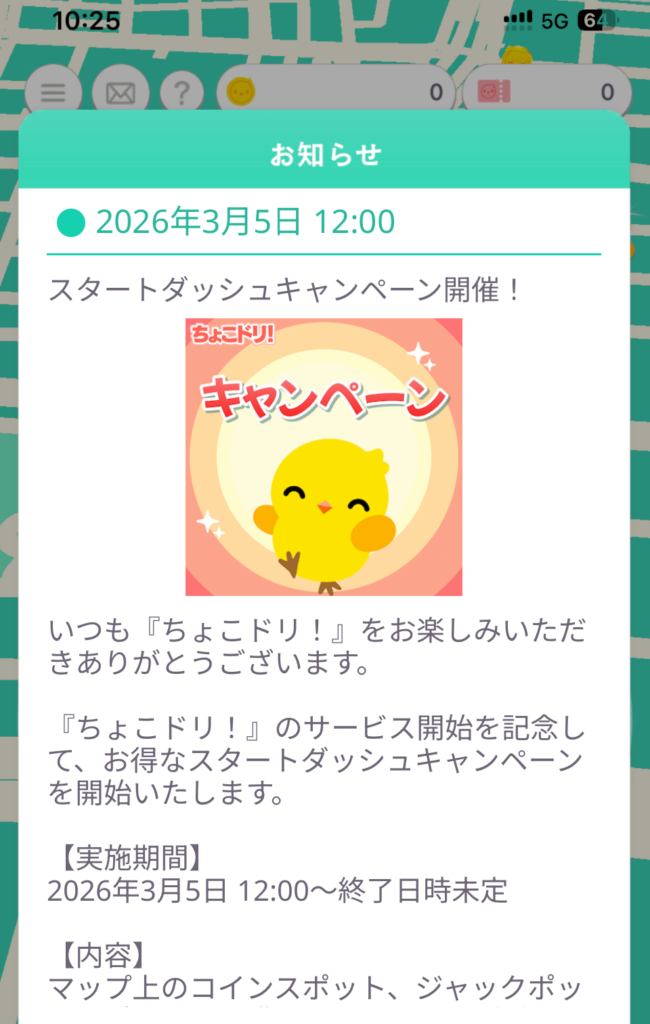 ちょこドリ!のサービス開始を記念して、3月5日12:00からの期間限定(終了日時未定)で、マップ上のコインスポット、ジャックポットスポットから獲得できるコインが、通常時の報酬より増量されるスタートダッシュキャンペーンが実施中です。