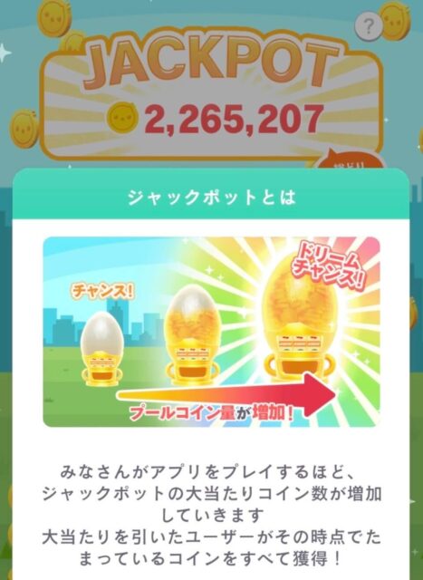 また、全ユーザーが積み立てたコインを一気に獲得できるチャンスとして「ジャックポット」機能が搭載されており、通常のコイン収集とは異なる大量獲得の醍醐味を味わえます。