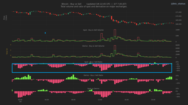 成行注文の動向を見ると、現物市場を中心に継続的な売りが観測されている(下画像青枠)。