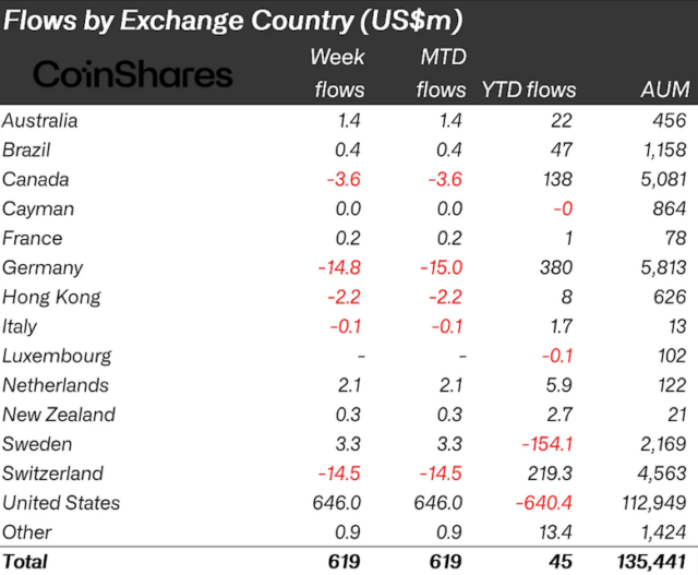 なお、以下はデジタル資産投資商品への資金フローを国別に見たデータ。バターフィル氏は、米国の市場心理がポジティブであるのに対し、欧州やアジア、カナダでは投資家の警戒感が強い傾向があると指摘した。