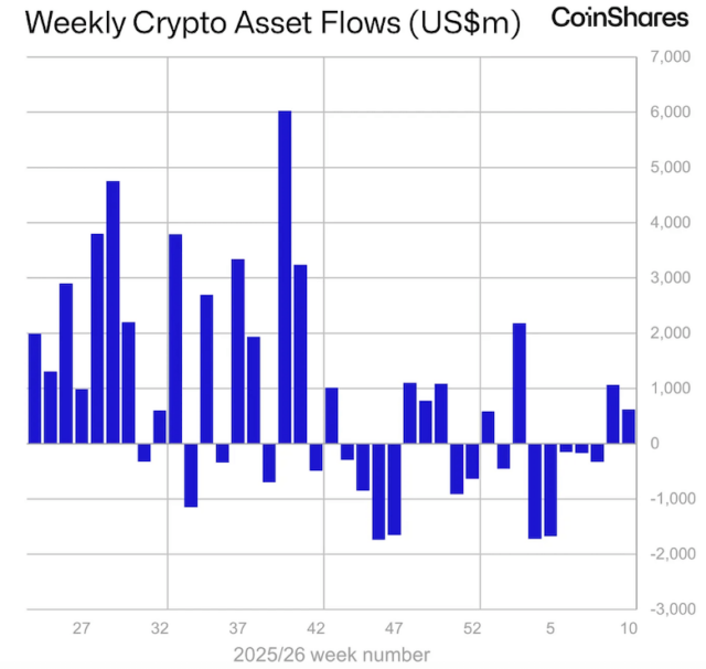 以下のグラフが、デジタル資産投資商品全体における週ごとの資金フローの推移。イラン情勢の先行きが不透明な状況ではあるが、2週連続で資金が純流入していることが示されている。