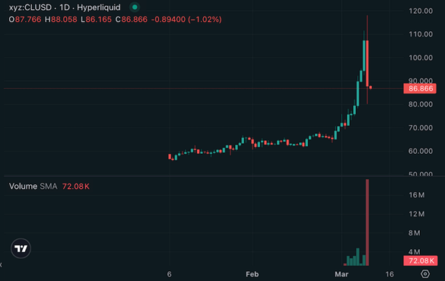 XYZプロトコルを提供するtrade[XYZ]の公式Xアカウントは10日、原油取引の2つのコントラクト(「CL」と「Brentoil」)における取引高が、金曜日に従来の市場における取引が終了した後、25億ドル(約3,946億円)を超えたと報告。以下は、「CL-USDC」のチャートで、たしかに取引高が急増していることがわかる。