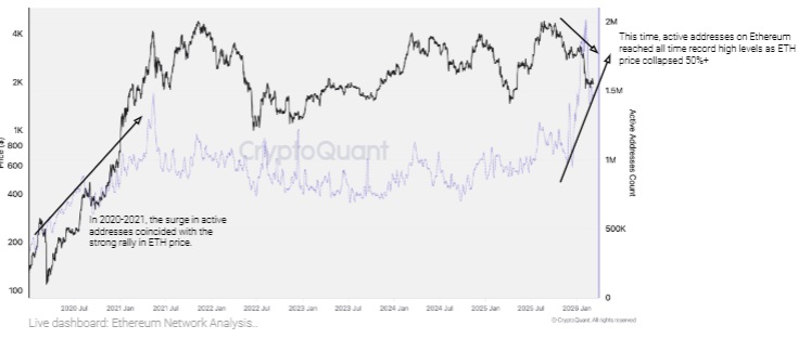 クリプトクアントは、これは以前のサイクルとは異なる動きだと指摘した。2021年には、イーサリアムのアクティブアドレスの急増は、価格の力強い上昇と同時に起こっていた。