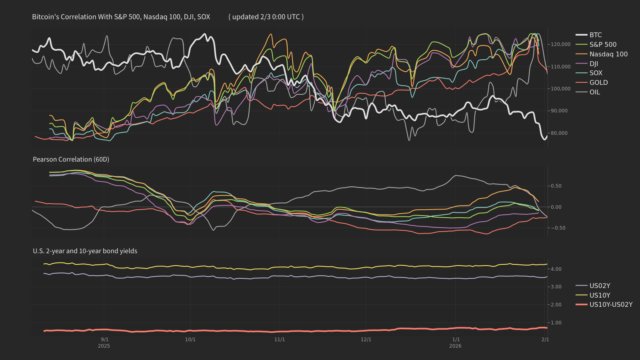 他アセットクラスとの2カ月ベースの相関を見ると、S&P500とは-0.09、ゴールドとは-0.25、原油とは-0.24となっており、いずれも強い相関関係にはない。地政学リスクが高まる局面において、ビットコインは伝統資産に連動するのではなく、独自の材料で価格形成が進んでいることが分かる。