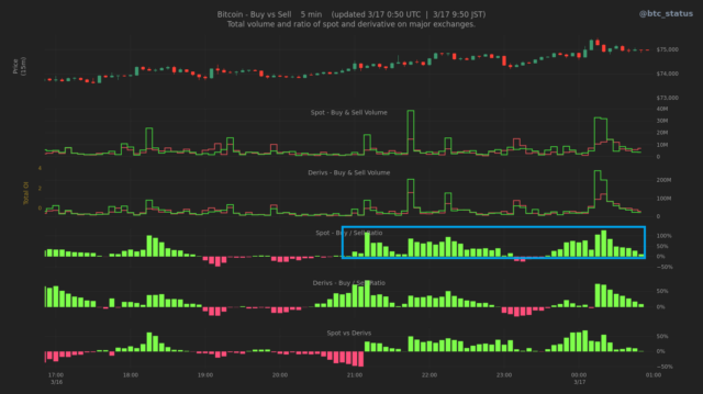 3月16日から17日にかけての相場動向を見ると、成行注文では現物主導の買いが顕著である(下画像青枠)。今回の上昇が先物主導の短期的な値動きではなく、現物市場を中心とした実需を伴うものであることがうかがえる。