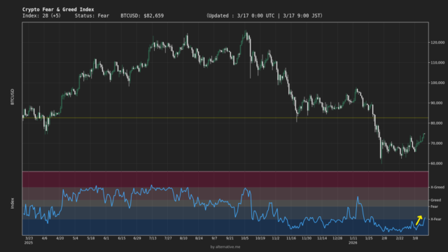 また、「Fear & Greed Index(仮想通貨の恐怖と貪欲指数)」は、市場参加者が最も強い恐怖を抱く「Extreme Fear」から「Fear」の水準へと改善した。依然として慎重姿勢は残るものの、過度な悲観はやや後退しつつあると評価できる。