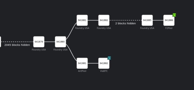 AntPoolがブロック941881を生成し、直後にViaBTCがブロック941882を生成して一時的なチェーンを形成した。しかし、同時にFoundry USAが独自のチェーンで7つの連続したブロック(941879から941885)を生成し、最長チェーンとしてネットワークに承認された。