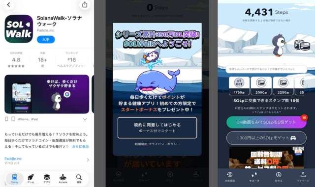 通勤・通学・散歩といった日常の移動をするだけでアプリ内ポイント「SOLp」を獲得でき、貯まったSOLpを仮想通貨のSOL(ソラナ)に手数料無料で交換できるのが最大の特徴です。価格予測やガチャといったゲーム要素も充実しており、楽しみながらコツコツ貯められる設計になっています。