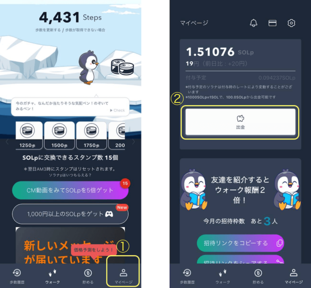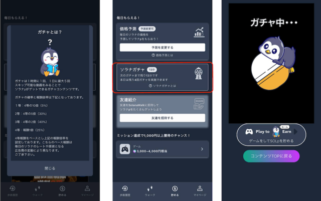 連携が完了したら、あとは日常生活を送るだけです。ウォーク画面からSOLpを受け取り、価格予測やガチャも組み合わせると効率アップです。