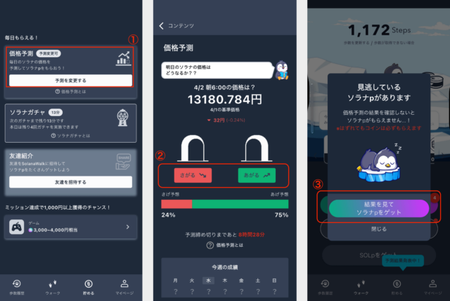 毎日6時のSOL価格が、前日の6時と比べて「上がっているか・下がっているか」を予測するシンプルな機能です。予測して翌日の6時以降に結果を確認するだけでSOLpを獲得できます。