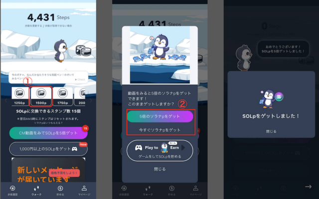 ※1日の上限は12,500歩・最大50回まで。ベースのSOLp報酬はSOLのレートや広告費によって変動します。