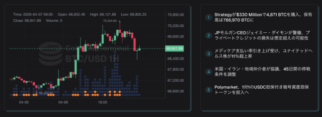 ビットコイン(BTC)は6日から7日にかけて上昇し、一時7万ドルを回復した。足元では、米国とイランの間で停戦期間を45日とする協議が進んでいるとの観測が浮上しているが、交渉の先行きにはなお不透明感が残っており、市場では中東情勢を巡る地政学リスクが引き続き意識されている。