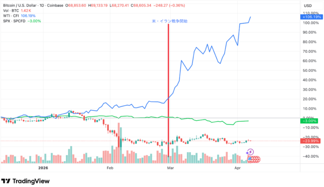 紛争中のビットコインの値動きは、仮想通貨固有の要因よりもマクロ環境を反映したものとなっている。約7万4,000ドルから6万5,000ドルへの下落は、原油急騰やインフレ期待の高まりと同時進行した。