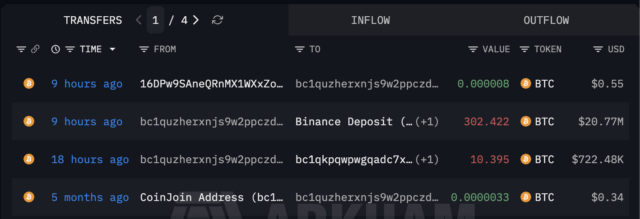 - 1つのウォレットが302.422BTCをバイナンスへ送金
