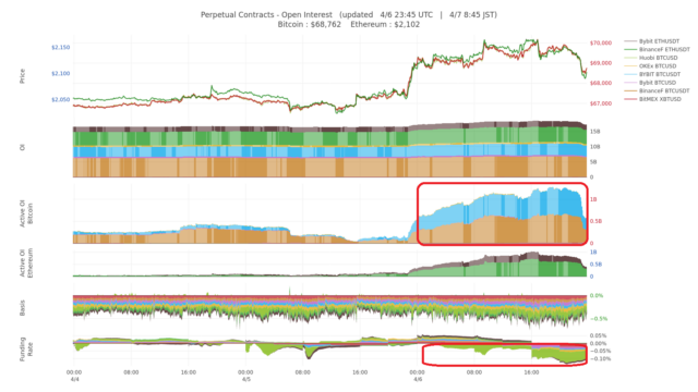 米国とイランが2週間の停戦に合意した後も、イスラエルによるレバノンへの攻撃は継続しており、中東情勢を巡る地政学リスクは依然として高い状態にある。加えて、エネルギー輸送の要衝であるホルムズ海峡では航行が限定的な状況となっており、市場の緊張感はなお強い。そのなかで、一部ではホルムズ海峡の通行料支払いにビットコインが利用されていることが判明し、これが材料視されて買いを誘った格好である。