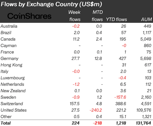 また、以下はデジタル資産投資商品への資金フローを国別に見たデータ。バターフィル氏は、スイスが純流入を主導したことや米国の純流入額が3位であることなどを指摘している。