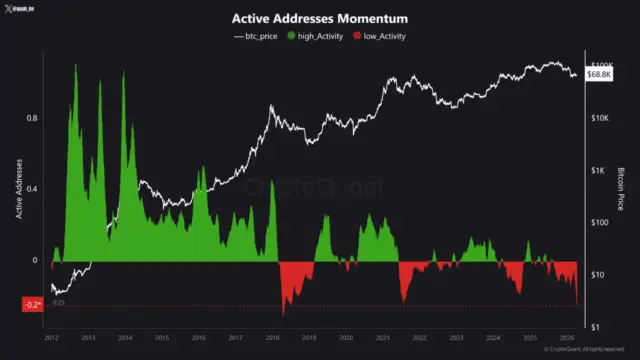 オンチェーン分析プラットフォームのクリプトクォント(CryptoQuant)に寄稿するアナリストのガー(Gaah)は7日、ビットコイン(BTC)のアクティブアドレス数が2026年に入り8年ぶりの最低水準に達したと報告した。