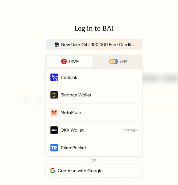 B.AIはTRON、BNB Chain、EthereumなどのEVM互換ネットワークをサポートし、TronLinkやMetaMaskでのログインに対応する。