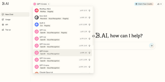 現在B.AIは、ChatGPT、Claude、Geminiなどの主要モデルに加え、MiniMax、Kimi、GLMなど高性能・低コストモデルを統合している。単一ダッシュボードからすべてのモデルを利用可能。API利用については統合キーを採用し、B.AI API Keyの生成によりすべての統合モデルAPIへアクセス可能となる。