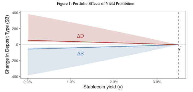 2025年7月に成立したジーニアス法は発行体による直接の利回り付与を禁じており、現在審議中のクラリティー法案でも同様の制限の是非が最大の争点となっている。米国独立地域銀行協会(ICBA)などの銀行側は、利回りが解禁されれば最大1兆3,000億ドルの預金が流出し、8,500億ドルの融資減少につながると警告してきた。