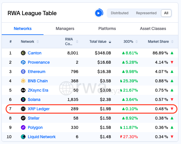 RWAトークン化の主要ブロックチェーンランキング。XRP Ledgerは総額19億ドル規模で7位に位置している(出典:rwa.xyz)