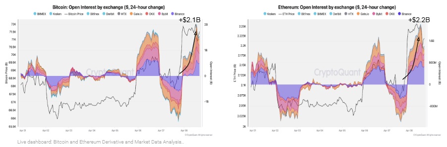 この価格上昇は、永久先物市場のトレーダーによって牽引された。ビットコインとイーサリアムの永久先物における建玉残高は、24時間以内にそれぞれ21億ドルと22億ドル増加している。